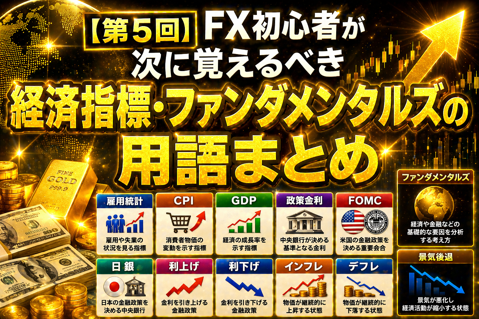 この記事はシリーズ第5回として、FX初心者が次に覚えるべき経済指標・ファンダメンタルズの基本用語をまとめます。