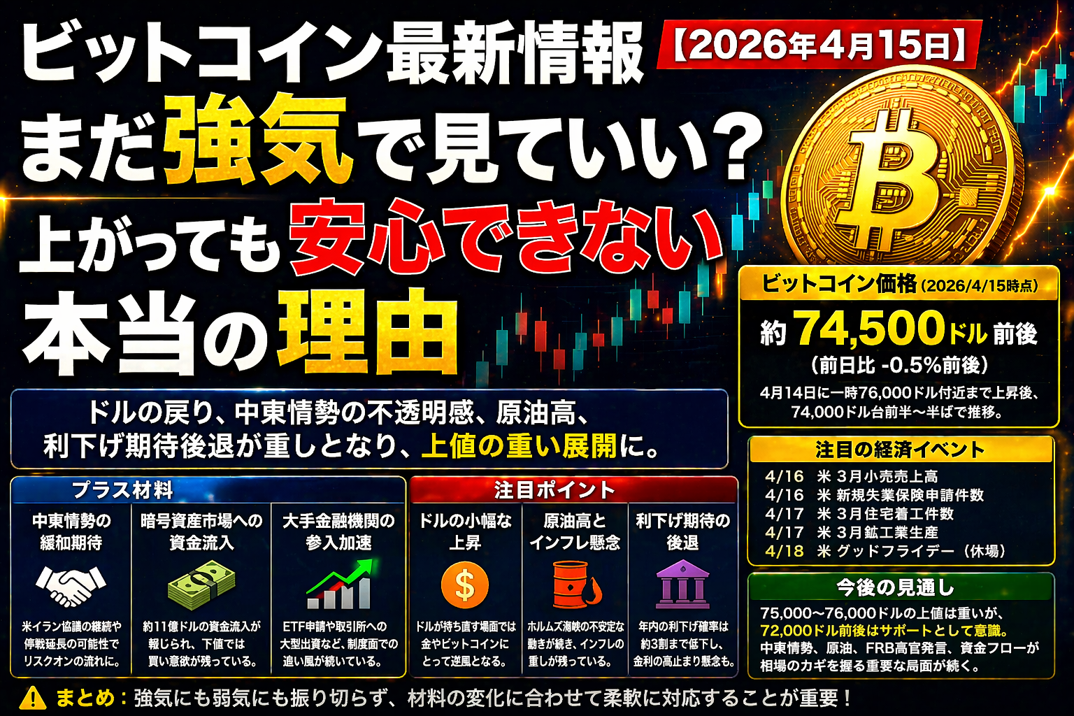 最後にまとめると、2026年4月15日のビットコイン最新ニュースの本質はかなり明確です。ビットコインは持ち直している。けれど、それは安心しきった強さではなく、ドル安とリスクオンで評価し直されている強さです。76,000ドル近辺まで上がる場面があり、暗号資産市場には11億ドル規模の資金流入も報じられました。一方で、利益確定売りや中東情勢に伴うエネルギー高が上値を抑えています。だから今のビットコインは、強気にも弱気にも振り切らず、何が主役材料なのかを毎回確認しながら見る相場だと考えるのがいちばん自然です。